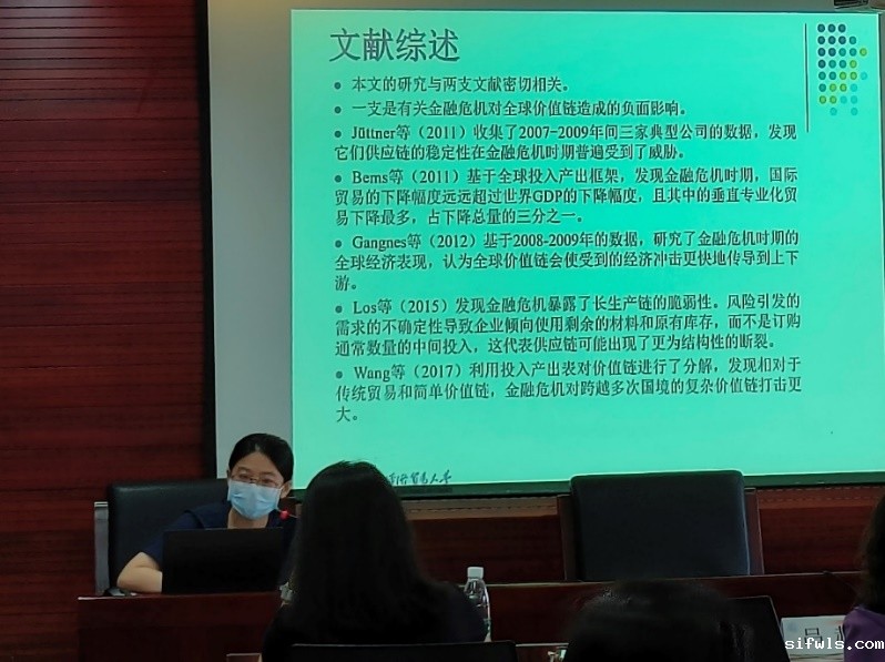 李妙晨同学以“外部风险对中国进口高技术品价值链的影响——以2007年金融危机为例”为题进行论文宣讲。她利用美国人口普查局披露的高技术产品目录,计算出了中国2002-2021年的HS6位码进口数据中各产品的高技术密度与加权平均贸易距离。在此基础上,利用双重差分模型研究了2007年的金融危机风险对进口高技术价值链的影响。