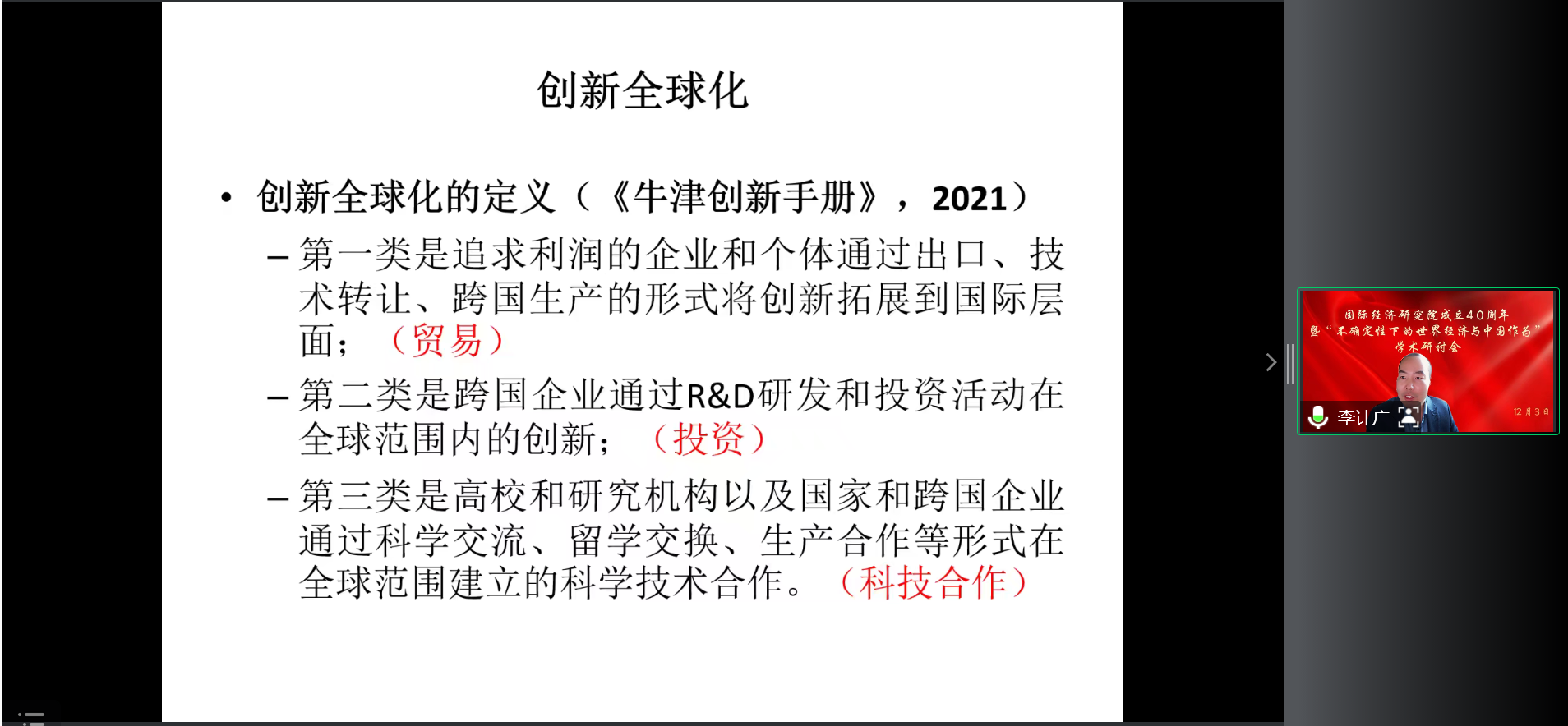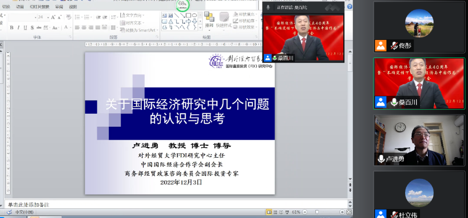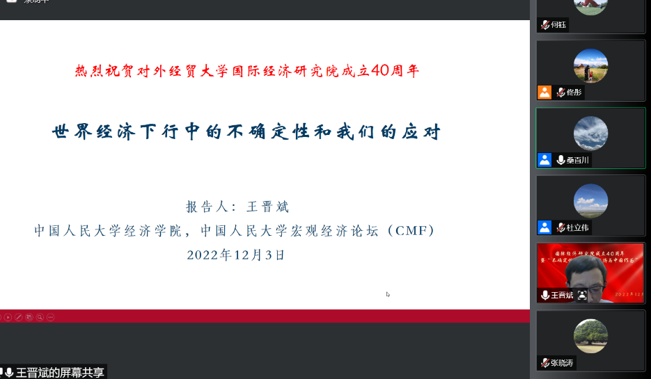 12月3日,为庆祝建院40周年,由主办的“不确定性下的世界经济与中国作为”学术研讨会在线上成功举行。来自国务院发展研究中心、南开大学、中国贸促会研究院、中央财经大学、中国人民大学、北京师范大学以及的15位专家发表主旨演讲,200余位来自全国各地的老师、同学以及校友参加会议。