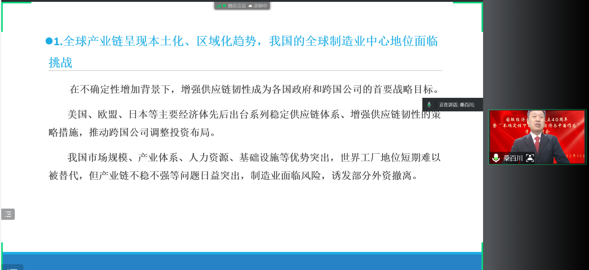 院长桑百川教授介绍了不确定性下的外商投资动向。他认为外部不确定性增加改变了跨国公司的投资逻辑,世界经济不确定性增加影响了跨国公司的投资行为,并在分析在华外资变化趋向的基础上,提出优化外商投资促进措施、推进制度改革创新等应对措施。