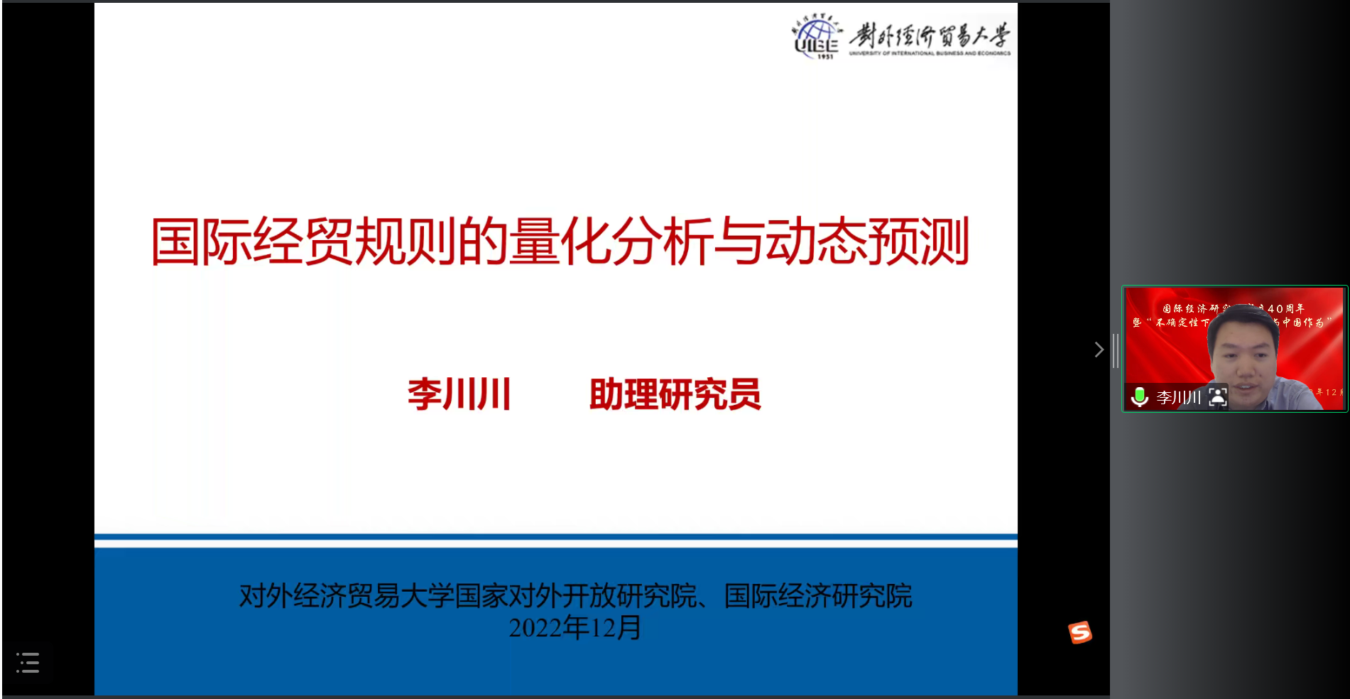 李川川助理研究员介绍了国际经贸规则文本解读与量化分析数据库的建设情况。该数据库由对外经济贸易学术团队开发,具备学术研究、政策研究、品牌建设、科研育人四大功能,已经发布了四期研究报告,计划定期发布《国际经贸规则量化分析报告》、WTO/FTA活跃度指数,逐步向社会公开五大数据库,并出版相关教材。