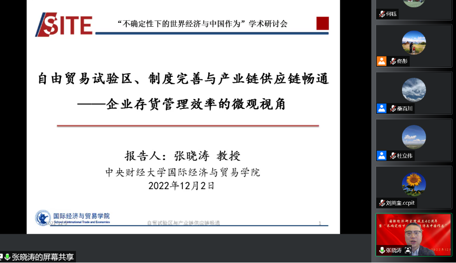 中央财经大学国际经济与贸易学院院长张晓涛教授以“自由贸易试验区、制度改善与产业链供应链畅通”为题发表演讲。他从企业存货管理效率的微观视角,验证了制度型开放对企业存货变化和管理效率变化的影响,提出了未来在政策角度对自由贸易试验区自主性开放以及制度完善的发力点。