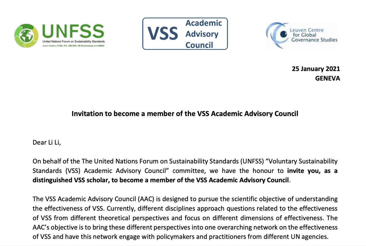 联合国可持续标准论坛(UNFSS)是由联合国贸易和发展会议(UNCTAD)、联合国粮农组织(FAO)、国际贸易中心(ITC)、联合国环境规划署(UNEP)和联合国工发组织(UNIDO)五个联合国机构联合发起的、协调联合国系统内外有关自愿性可持续标准(VSS)议题的平台,其主要目标是探讨VSS的价值,协调联合国各机构在相关领域的合作,并促进相关政策的一致性。VSS学术咨询理事会(Academic Advisory Council ,AAC)汇集了参与VSS研究的国际和多学科学术专家。AAC的目标是综合不同学科、不同理论视角对VSS有效性的研究,将这些不同的观点纳入一个关于VSS有效性的总体网络,并通过年度会议,使成员有机会讨论VSS最新研究以及“热门话题”。经过相关的推荐和审批程序,2021年1月25日,我院李丽老师正式获邀加入学术顾问理事会成为常任成员,并将参加AAC相关活动,提供中国视角。
